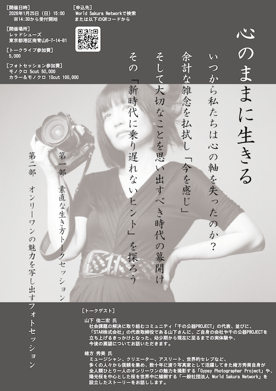 社会課題の解決に本気で取り組むコミュニティ「千の公器プロジェクト」の代表、並びに、「STAR株式会社」の代表取締役である山下 佳二宏 氏をスペシャルゲストとして招き、写真家であり当協会の代表理事でもある緒方秀美のお二人によるトークライブです。