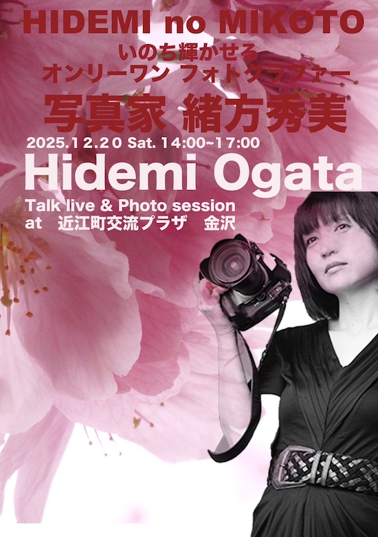 12/20 トークライブのご案内(石川県) 2025年9月27日2025年10月25日 いつも当協会をご支援いただき、誠にありがとうございます。 12月20日に、緒方秀美によるトークライブとフォトセッションが、石川県金沢市にて開催されます。 お申込方法などの詳細は、以下よりご確認いただけます。 https://kanazawa1220.peatix.com